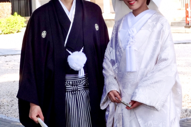 Traditional ceremonies for marriage in Japan are usually only attended by small groups of family members and close friends. The bridal couple wear special silk wedding kimono – for the bride, the elegant shiromuku (white kimono) or the luxurious iro-uchikake (coloured kimono), and for the groom, formal black montsuki (family crested) kimono with hakama (wide-legged pants).